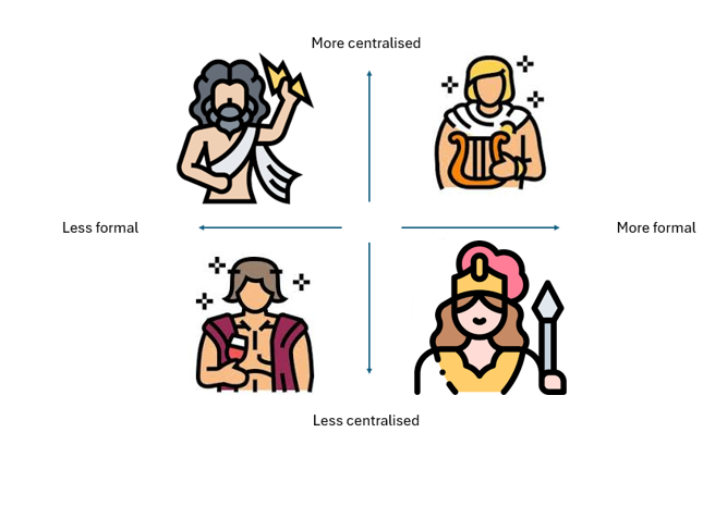 I’ve been looking into culture a lot recently. It’s a topic that is particularly key for businesses going through transformation (and let’s face it, that’s pretty much everyone right now) and it’s also been front of mind this last year as I moved into a new department and took time to think about the culture I wanted to shape. What has been a surprise to me is despite how much I’ve looked at from the post-pandemic era, the key framework I keep returning to is the work of Charles Handy from the 70s (and even then, he took inspiration from the Ancient Greeks!)
